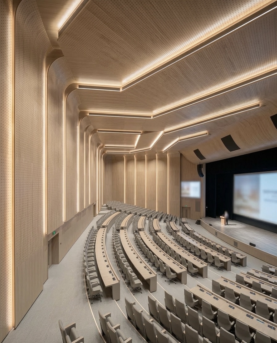 • Tiêu âm và giảm tiếng vang: Các lỗ nhỏ trên bề mặt tấm nhựa cho phép sóng âm xuyên qua và bị giữ lại hoặc phân tán trong các khoang rỗng hoặc lớp vật liệu đệm phía sau. Điều này giúp triệt tiêu tiếng vang (reverb) và làm âm thanh trong phòng trở nên trung thực, rõ nét hơn.